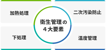 弊社では、食の安心安全を守るため、HACCP(危害要因分析に基づく必須管理点)の概念に基づき厚生労働省が作成している「大量調理施設衛生管理マニュアル」を取り入れた管理を行っています。